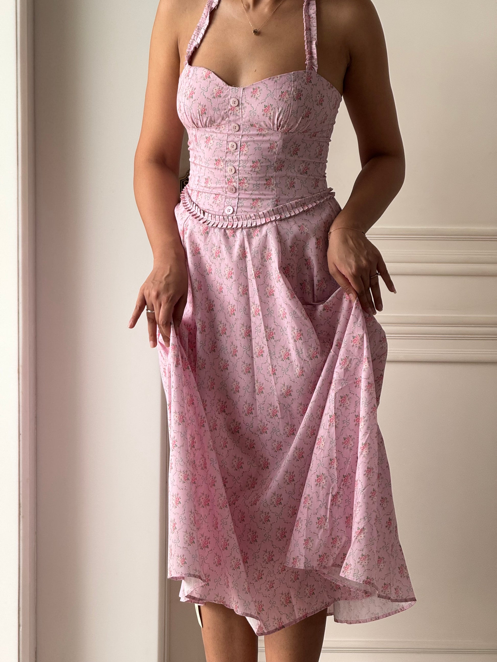 Meet ‘Lilia’ — a halter-neck midi cut from soft stretch cotton adorned with delicate trailing roses. It features a romantic sweetheart neckline, and vintage-style buttons down the front. The boned waist with a ruffled trim adds subtle definition, flowing into a pleated skirt that moves effortlessly. Graceful, classic, and made for sunshine moments.